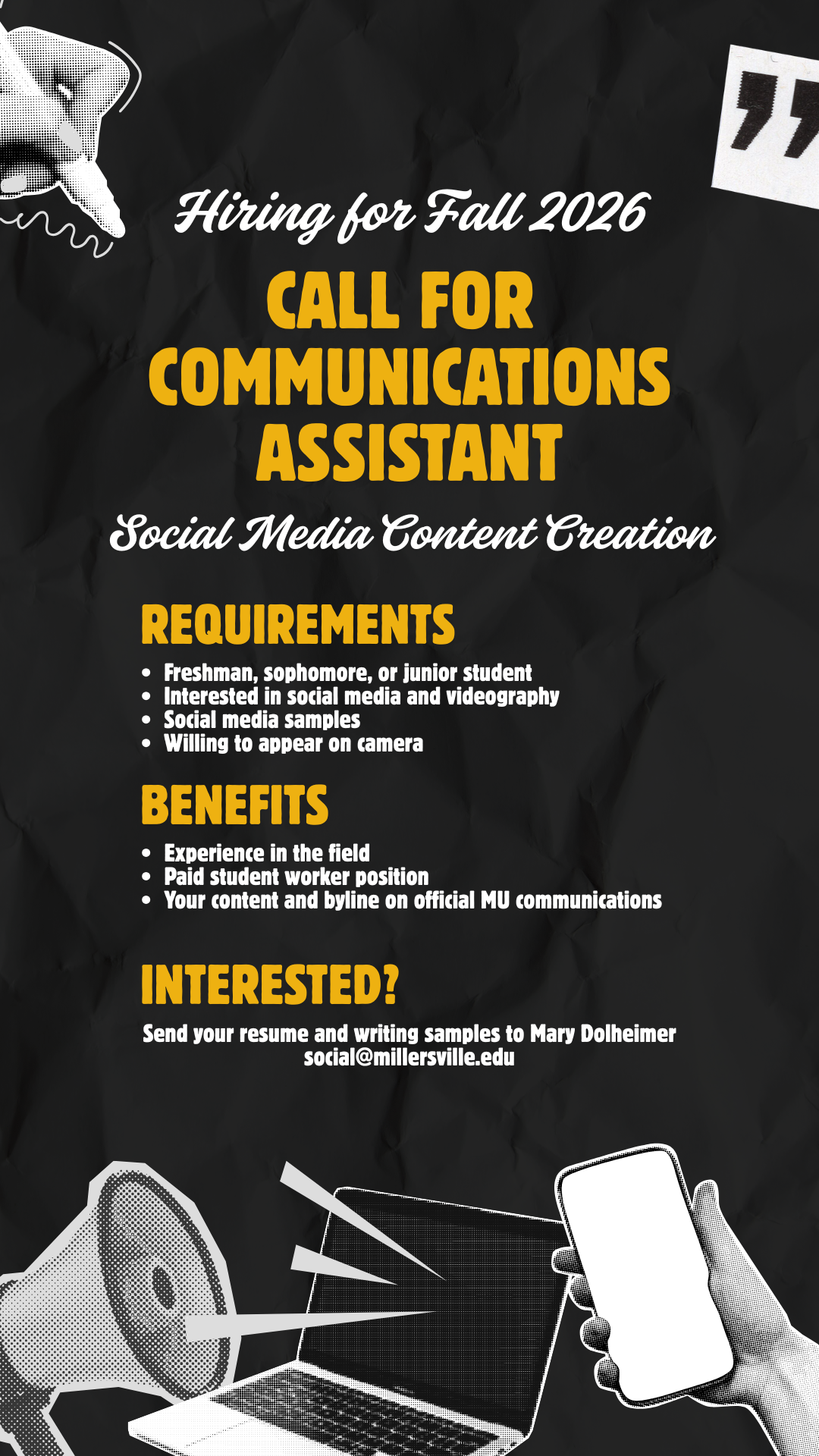Since Fall 2024, I have been a Graphic Design and Communication Assistant for Millersville University Communications and Marketing. This involves creating content forĀ and managing Millersville University social accounts to promote important University news and events.
